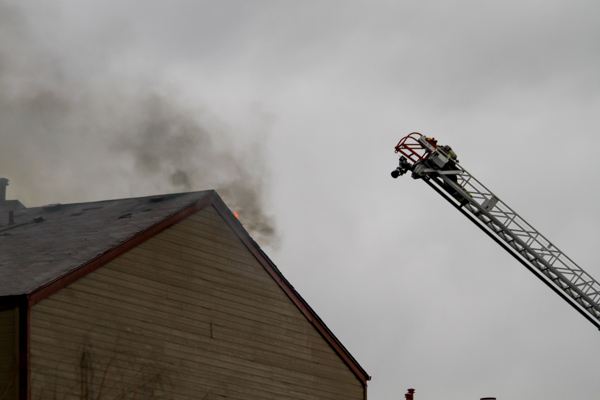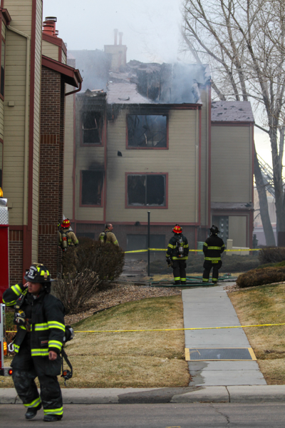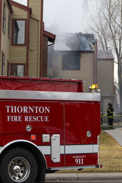 At 13:45 on March 4th, 2014 Thornton Fire Department responded to a reported structure fire at 8760 Corona St. Medic 72 arrived to heavy fire showing from two sides of a 3-story apartment building, and conducted a 360 and found heavy involvement to the Charlie side exposure. Engine 72 arrived and assumed command, established their own water supply and declared a defensive strategy with a 2nd alarm transmitted. Engine 31 positioned on the Alpha side and advanced a line toward the Charlie side. Battalion 31 arrived and took over command, and assigned Truck 34 to assist Engine 72 with fire attack. Truck 33 set-up for aerial ops on the Charlie-Delta side, and Truck 41 positioned on the Bravo-Charlie side, established a water supply and set-up for aerial ops. Battalion Chief 71 was assigned as Charlie division, and Engine 75 reported heavy smoke conditions inside the Charlie exposure, prompting a 3rd alarm. Engine 14 & Engine 23 were assigned to the Charlie division, and Truck 34 as RIT. Master streams from Truck 33 & Truck 41 were used on the main building with heavy fire that burned through the attic and caused a major collapse. Crews inside the Charlie exposure conducted searches which all proved negative and checked for extension. Crews remained on scene for several hours extinguishing hot spots and overhauling. All 12 units in the main fire building were a total loss and the American Red Cross was called to the scene to assist with displaced occupants. No injuries were reported and the fire cause is under investigation.