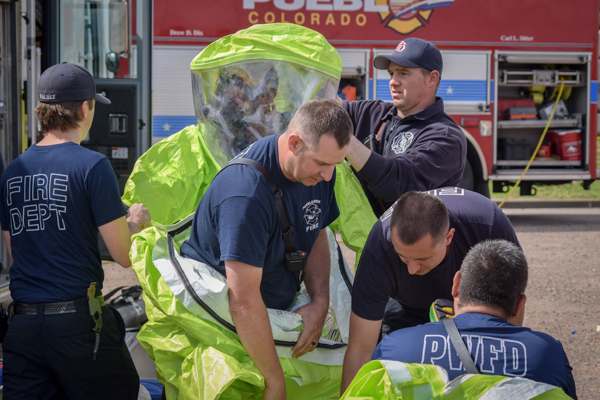 On May 8th, 2019 multiple agencies from across Pueblo County participated in the annual Chemical Stockpile Emergency Preparedness Plan Exercise. The CSEPP drill took place in the midtown shopping center at 1000 W. 6th St. in Pueblo. The exercise is a full-scale exercise designed to demonstrate community readiness for responding to a chemical incident. The situation includes a hazmat incident, multiple patients, and multiple tasks to overcome. It is evaluated on a federal level to make sure it is being run at its best. Crews from Pueblo Fire Department, Pueblo West Fire Department, Beulah Fire Protection District, Pueblo County Sheriff, Pueblo Police Department, Colorado State Patrol, American Medical Response – Pueblo, and several other local groups participated in the drill. Additional story & information provided by Code 4 Photography.