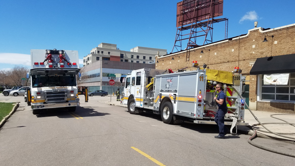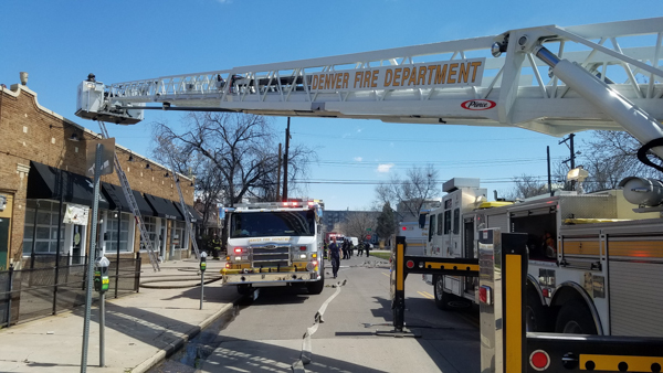 On April 14th, 2020 around 12:45 Denver Fire Department Engine 11 & Rescue 1 responded to a reported smoke investigation at E. 4th Ave. & Broadway. Crews arrived to find smoke showing from a one-story commercial building and requested a group response. Engine 11 laid in from E. 4th Ave. & Lincoln St. Tower 1 arrived and went to the roof and Engine 1 pulled a backup line in. Crews got the fire knocked quickly with minor damage with no extension and no injuries. As crews were picking up, another structure fire was dispatched with some of the companies responding to this one: Denver North Newton Street Fire. Additional information provided by Denver Fire Department