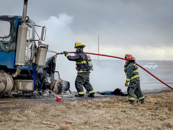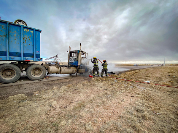 Just before 15:00 on March 19th, 2020 a Pueblo County Sheriff deputy had a tractor trailer pass him going southbound on I-25 that had flames showing from the cab. He was able to make a traffic stop between mile marker 106 & mile marker 105 and Pueblo County Sheriff Emergency Services Bureau (ESB) Fire Team was dispatched. Due to the high winds and a wildland threat mutual-aid was requested from Pueblo West Fire Department. Engine 833 arrived on scene first to a fully involved semi tractor. The trailer was not on fire and crews pulled a line and attacked the fire from the shoulder. Tender 191 arrived and provided water to Engine 833 while Tender 192 served as a blocker shutting down the slow lane. Brush 861 and Brush 161 also responded to prevent any wildland involvement. Both units cleared quickly and returned to service. Additional information provided by Code 4 Photography