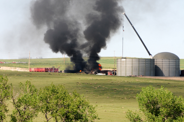 On June 5, 2021 at approximately 13:47 pm Bennett-Watkins Fire Rescue responded to a reported brush fire near S. Watkins Rd. north of E. Quincy Road with multiple callers reporting flames and a dark black smoke plume that could be seen as far south as Castle Rock. Dispatch updated that the fire was involving fracking equipment and not brush. Chief 42 advised Chief 92 that a ranger was on top of the reservoir and could see heavy flames and smoke. Brush 92 arrived on scene near Watkins Road and Yale Avenue on an oil service road, reported multiple pieces of equipment fully involved with evacuation in progress at an oil drilling site. At 14:00 Chief 92 requested an East I-70 Corridor automatic-aid agency tender response. Chief 42 arrived on assumed command, Chief 92 requested Chief 42 assume HazMat command. Aurora Battalion 4 arrived on scene and setup a unified command with Bennett Fire. Crews determined that 19 different hazardous chemicals could be involved and set up a 3 mile safety zone in case of an explosion. Firefighters were able to mitigate the hazard from the chemicals just after 19:00 and sent foam trailers in to smother the blaze. The fire was ruled under control about 19:45. Parts of Quincy and Watkins Roads were closed and aircraft were diverted from the area as part of the safety zone. No injuries were reported and the cause of the fire is under investigation.