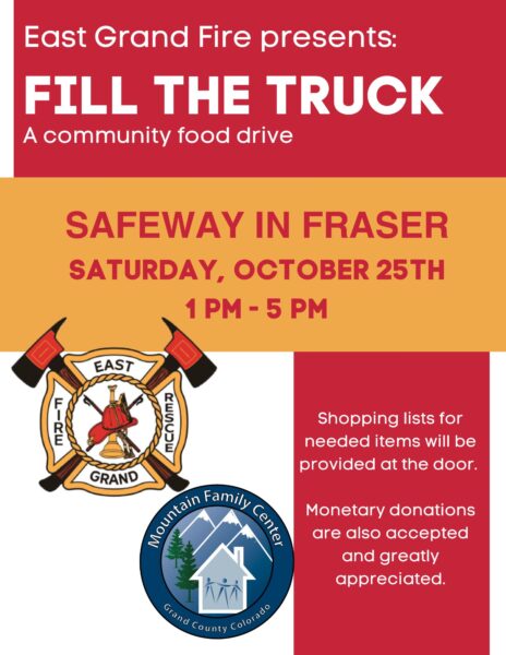October 25 @ 13:00 - 17:00 MDT East Grand Fill the Truck Food Drive Safeway in Fraser 40 County Road 804, Fraser, CO, United States