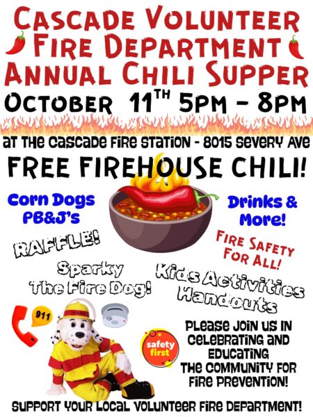 October 11 @ 17:00 - 20:00 MDT Cascade Chili Supper Cascade Fire Department 8015 Severy Avenue, Cascade, CO, United States