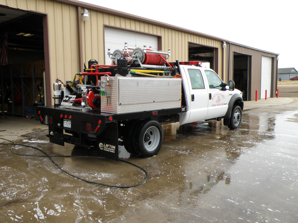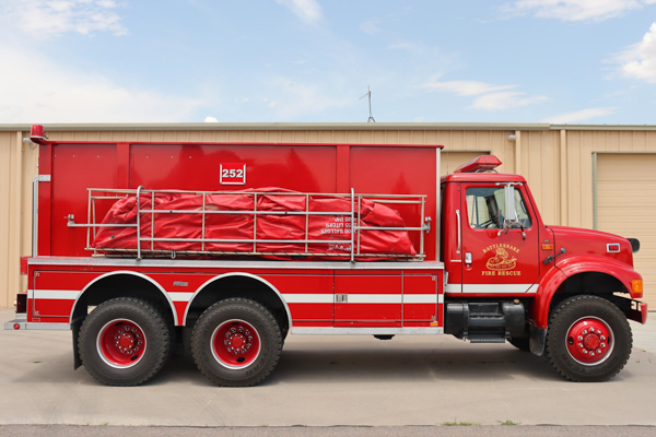 (402) 1991 International 4900 Fire Line / Central States 3000 gallon water tank. Former Tender 52.