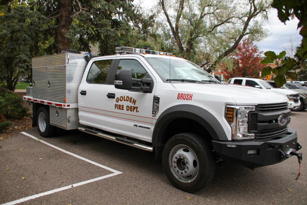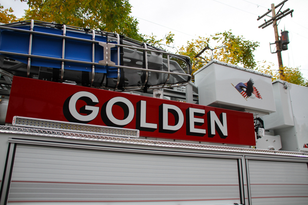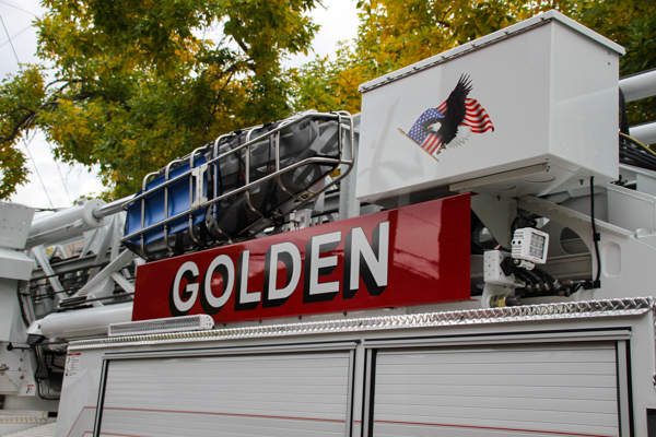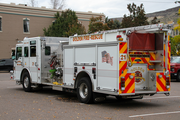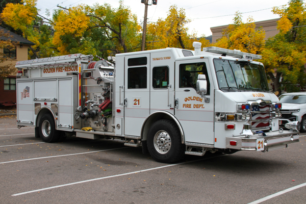 Engine 21 shown here with a dedication on the side of the cab to Thomas D. Young. Tom joined the Golden Fire Department as a volunteer in 1982. In July 1990, Young was critically injured during the rescue of a downed hang glider pilot on Lookout Mountain. His injuries left him paralyzed from the neck down. Today, Young is the volunteer administrative Captain of the Department’s Media Services.