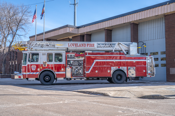 2002 HME 1871 Series / Ferrara (H-2032) / Smeal 75′ rear-mount quint 1500 GPM (Hale QMAX 150) side-mount pump, 400 gallon water tank and 40 gallons of foam. Former Truck 1 and twin to former Eaton Fire Protection District (Colorado) Ladder 2331. Purchased in 2025 from Berthoud Fire Protection District. Housed at Station 1