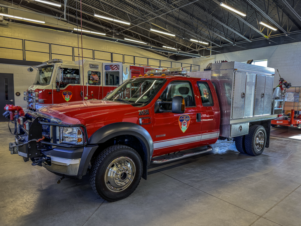 2005 Ford F-450 4×4 Super Duty 500 GPM pump, 400 gallon water tank with foam. Functions as a tow unit for all enclosed and foam trailers and serves as a reserve brush truck.
