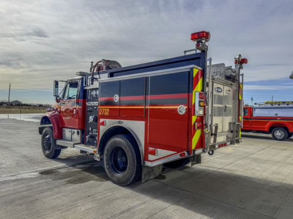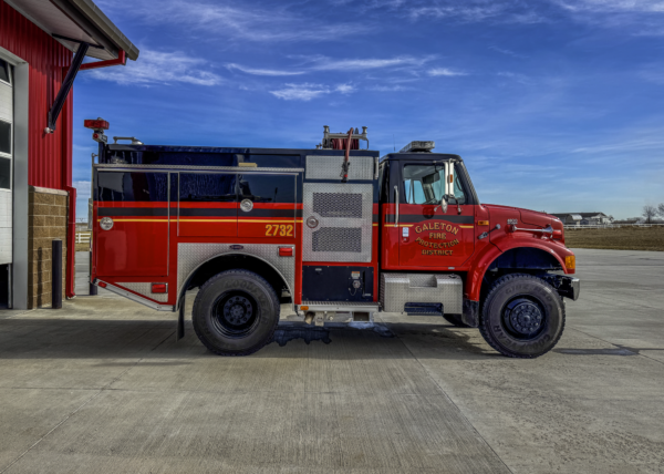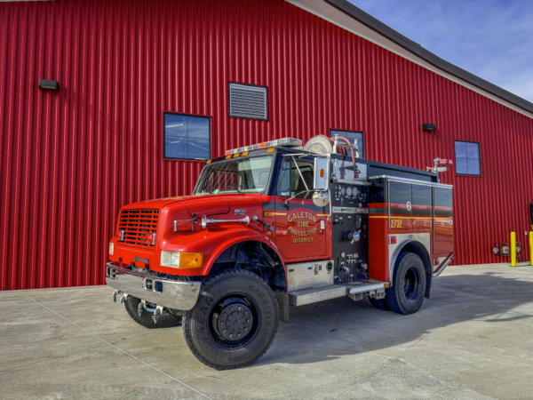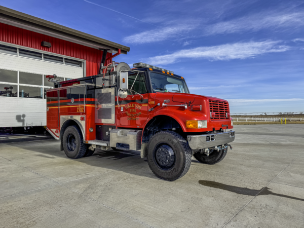 1997 International 4900 4×4 / E-One Wildcat (18074) Type 3 500 GPM pump, 500 gallon water tank and 20 gallon foam cell. Former Platteville Fire Protection District (Colorado) Brush 1 and Brush 3632. Formerly housed at Galeton Station 1 and shown here after the refurb.