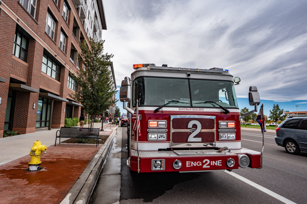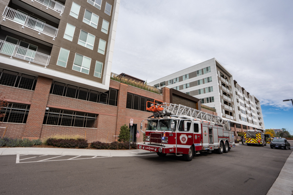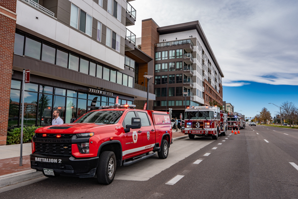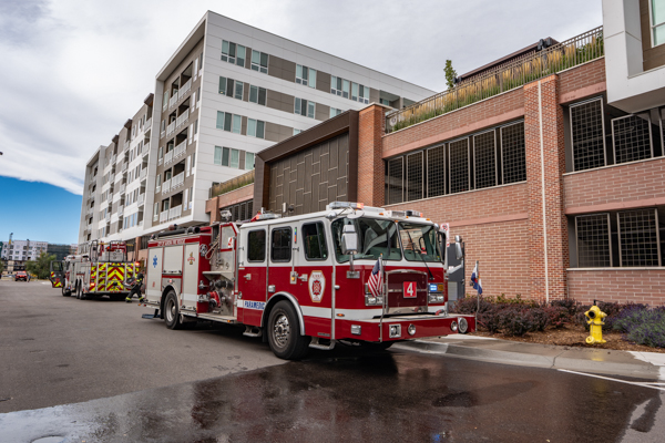 October 19th, 2025 Aurora Fire Rescue responded to the 6-story Fellow at Fitz complex, located at 12600 E. Colfax Ave. just after 13:00 on a possible structure fire. First arriving Engine 3 sized up nothing showing on arrival and made their way to the fourth floor with hose packs and tools. Battalion 2 assumed command, Engine 2 established a water supply on E. Colfax Ave., Engine 2 and Ladder 2’s crew were assigned to assist Engine 3. Engine 3 reported no alarm activation in the building and no smoke in the hallways. Upon reaching the apartment in question an odor was present, and the apartment was filled with smoke. Command transmitted a second alarm due to the high population inside the building and potential complexity of incident operations. Level two staging was identified in the south parking lot of the Anshutz Inpatient Pavilion (AIP). Engine 4 established a water supply on the Charlie side and prepared to supply the FDC, and Ladder 5 also positioned on the Charlie side. Battalion 1 completed a 360 and assumed incident safety. Engine 3 found flames on the stovetop spreading to kitchen cabinets and quickly controlled the fire with a water extinguisher. With no extension to neighboring units, Command cancelled all additional responding resources. One dog was located inside and reunited with its humans, and crews worked for the next 45 minutes ventilating smoke from the apartment and hallway. 2 adults and 2 juveniles were displaced and are being assisted by the American Red Cross. No injuries occurred and the fire was accidental.