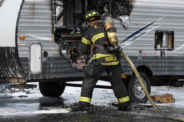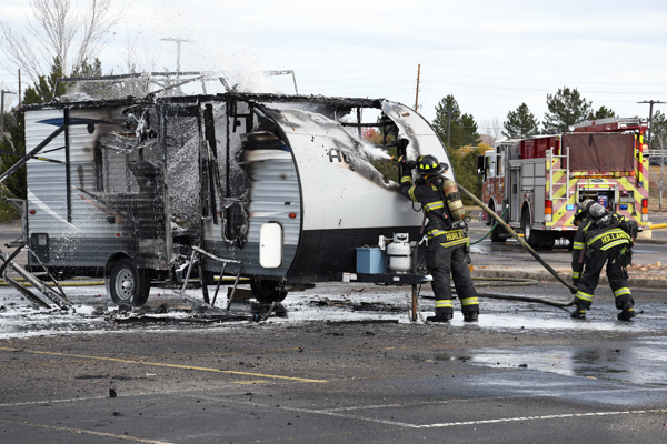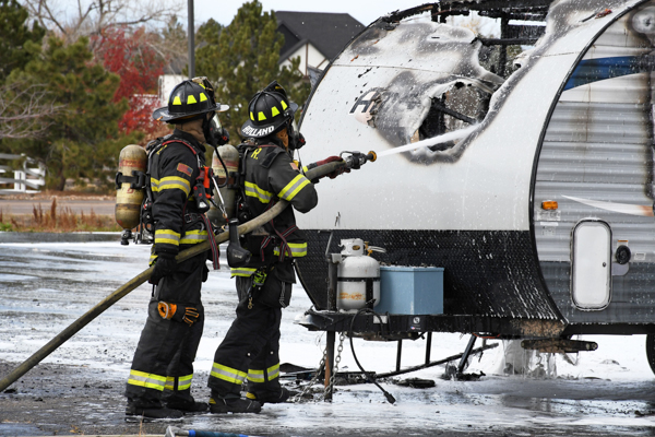 On November 7th, 2025 at approximately 11:20 South Metro Fire Rescue was dispatched to a reported vehicle fire at Fellowship Community Church, 6263 S. Parker Rd. in Centennial. Engine 42 reported a dark smoke plume in the air as they were responding. Units arrived on scene and found a camping trailer heavily engulfed in fire. Crews were on scene about 30 minutes extinguishing the fire and mopping up. No injuries were reported and the cause is under investigation.