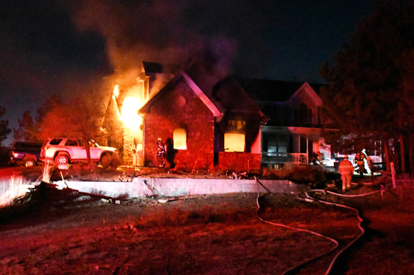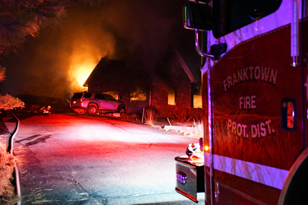 On December 22nd, 2025 at approximately 05:20 Douglas Regional 911 Communications Center dispatched Franktown Fire Protection District and Elizabeth Fire Protection District to a reported residential structure fire at 1184 Deerpath Rd. in Franktown. Engine 181 arrived on scene and found heavy fire coming from the garage of a multi-story single family residence. Crews had to be extra cautious after learning that there was ammunition in the garage and moved to defensive operations after part of the roof collapsed above the garage. Additional assistance was summoned from neighboring departments. Crews were on scene about three hours extinguishing the fire, mopping up hot spots and conducting overhaul. No serious inquiries were reported and the cause of the fire is under investigation.