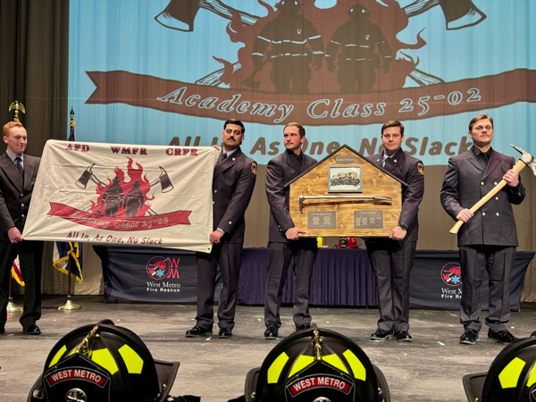 The members of West Metro Recruit Academy Class 25-02 graduated on December 19th, 2025 after more than four months of grueling training on the fireground and hundreds of hours in the classroom. There were 28 recruits in this class, 19 from West Metro Fire Rescue, 7 from Castle Rock Fire Rescue, and 2 from Arvada Fire Protection District. Their class motto: All In, As One, No Slack. Part of the tradition of recruit academy graduation is the badge pinning, where loved ones pin on a recruit’s new badge for the first time. Family members and loved ones are included in the ceremony to show appreciation for their support during the long months of training. Additional information was provided by West Metro Fire Rescue