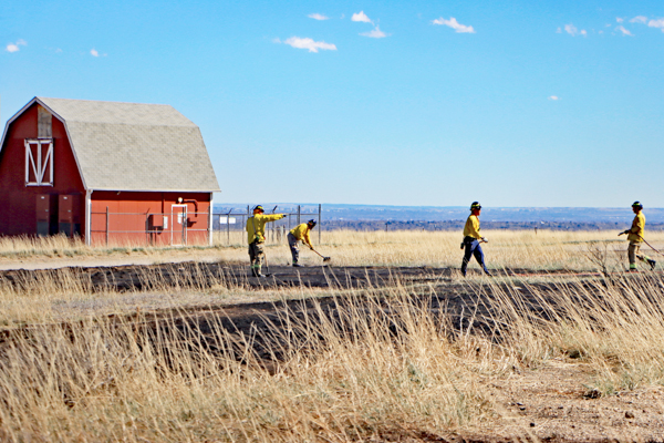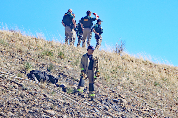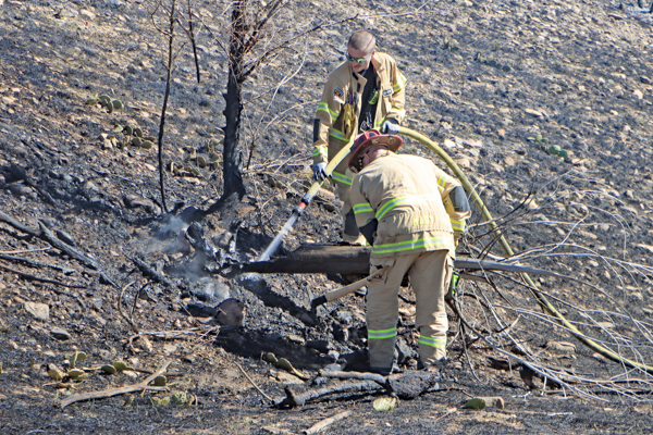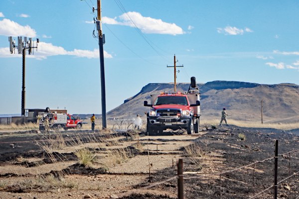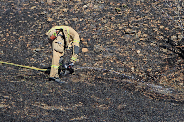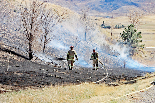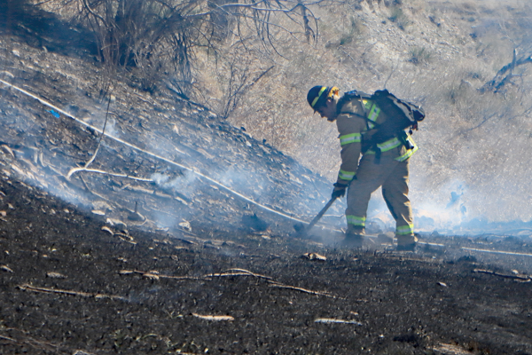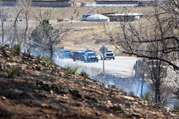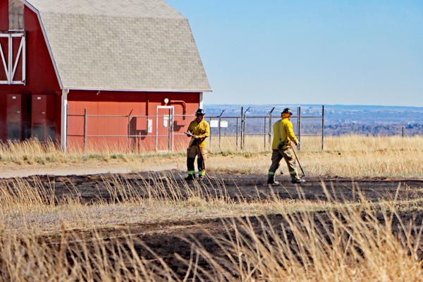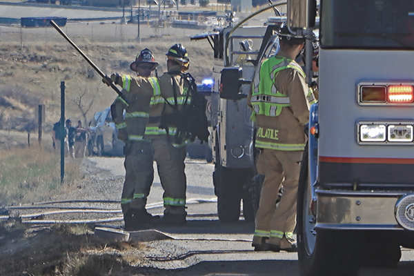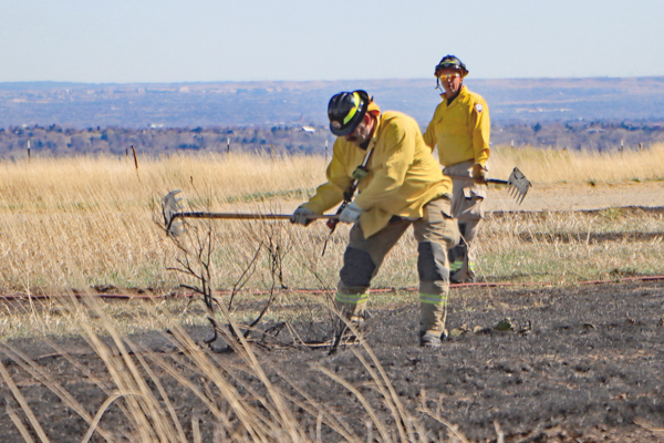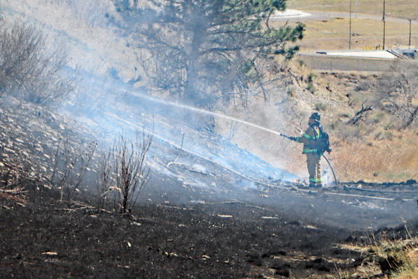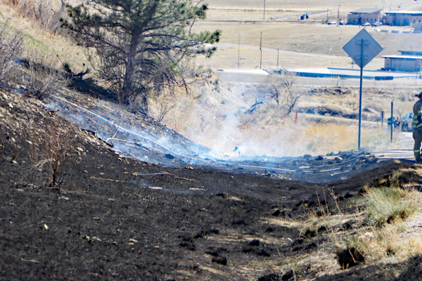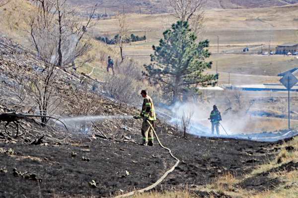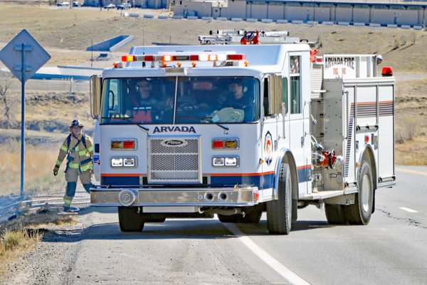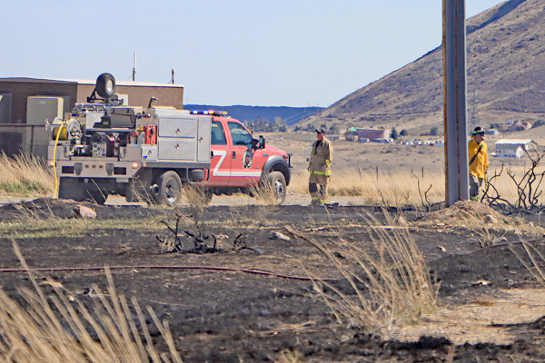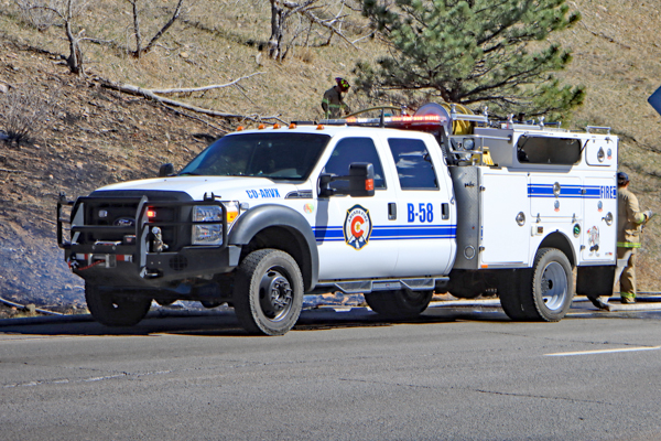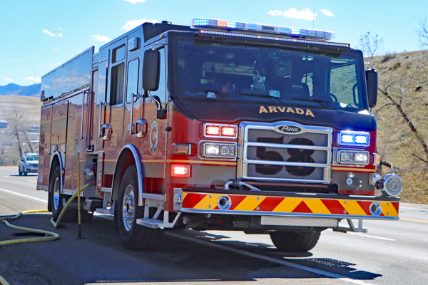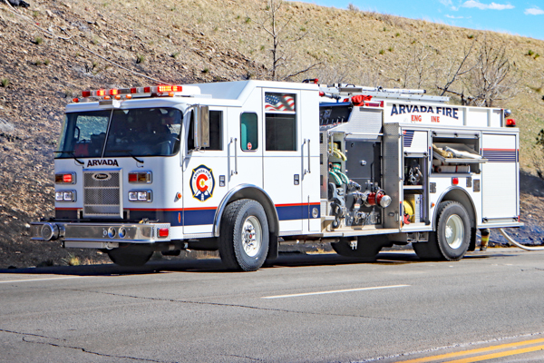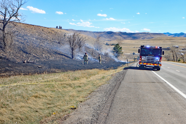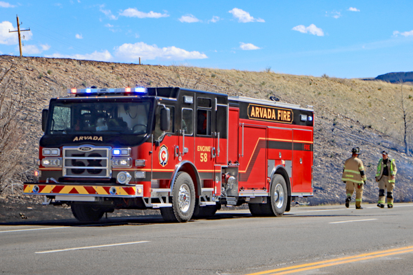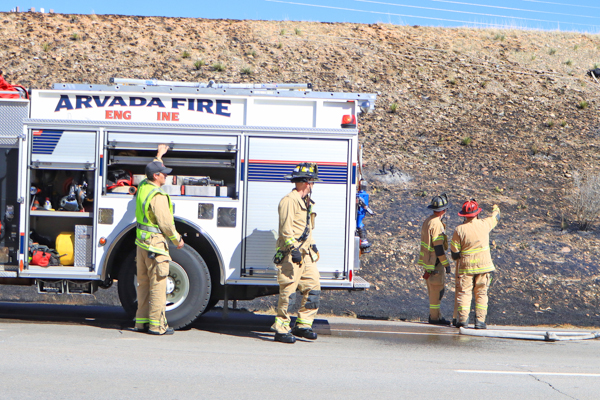 On March 25th, 2026 at 14:28 the Arvada Fire Protection District Engine 58 and Brush 60 was dispatched to a possible grass fire fire in the area of W. 64th Parkway by Hwy. 93. Battalion 53 arrived on scene of a small slow-moving vegetation fire burning up-slope in dry fuels on the east side of Hwy. 93 just north of W. 64th Parkway. Brush 58 arrived and started fire attack on the south flank and Engine 58 started on the north flank with Brush 60. Brush 58 advised that a cell tower and a related single structure with several vehicles and staff was threatened and command requested additional units to respond. Engine 56 arrived and set-up with water supply operations. Firefighters were assigned to hose lines and hand tools to extinguish the fire. The fire was quickly put under controlled at 14:53 and crews soon conducted an extended overhaul on hot spots. The fire burned two acres and the cause is under investigation. Additional information provided by Arvada Fire Protection District