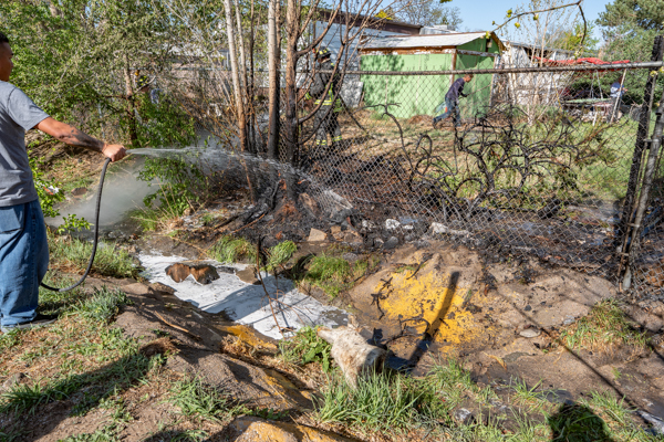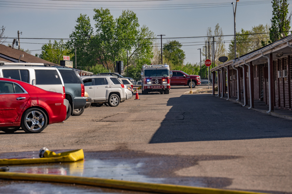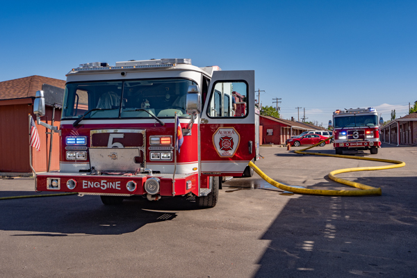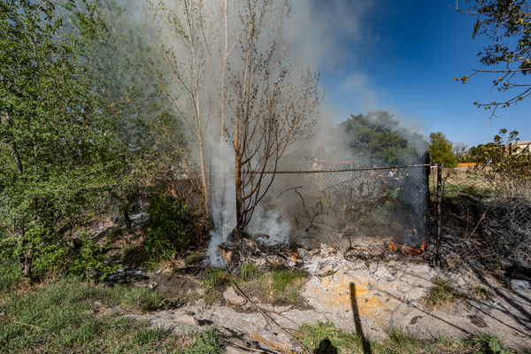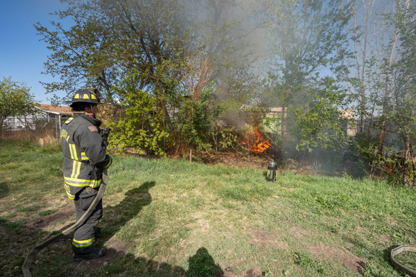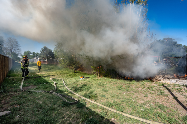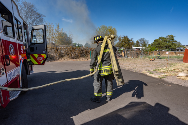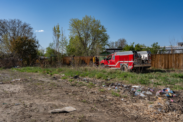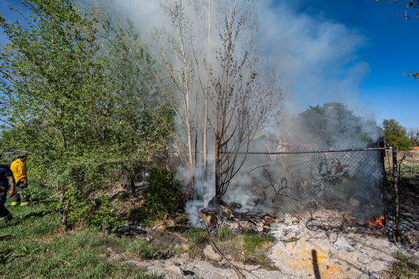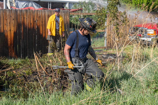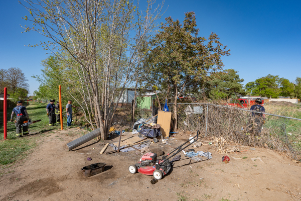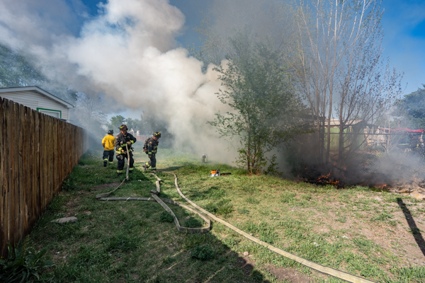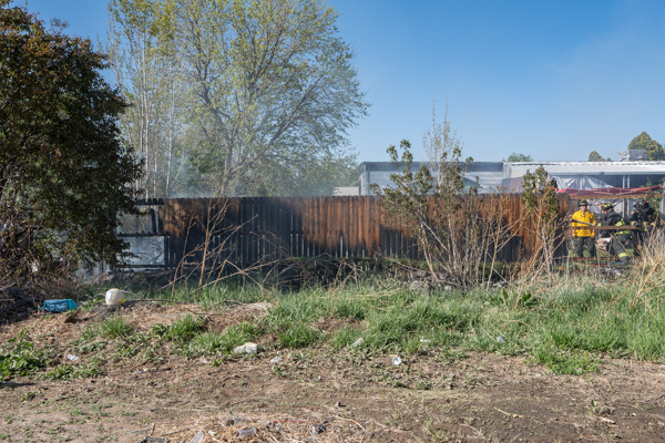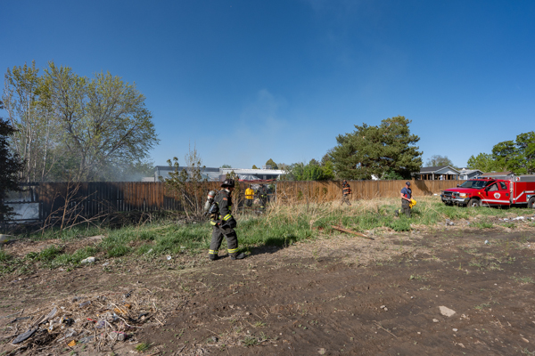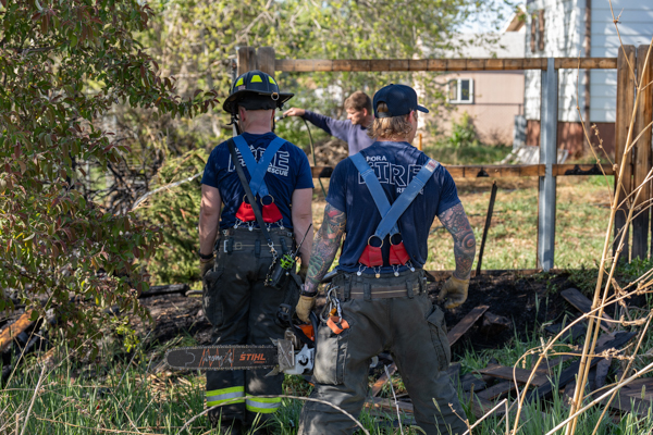 Around 16:00 on April 19th, 2026 Aurora Fire Rescue was dispatched to numerous reports of a fire possibly threatening a mobile home near E. Colfax Ave. and N. Sable Blvd. Ladder 5 was already in the area after clearing a call and was first on scene. Ladder 5 accessed the fire from the Pacesetter Motel and used water cans to slow the fire spread, and an additional Engine and Brush were requested. Engine 5 arrived and pulled a 1 3/4 crosslay and quickly controlled the fire burning a wood fence, debris and vegetation. Engine 3 assisted with water supply and Brush 3 accessed the open space and used a booster line for mop up. No injuries occurred, no structures were damaged and the fire appeared to be accidental. Additional information provided by Aurora Fire Rescue