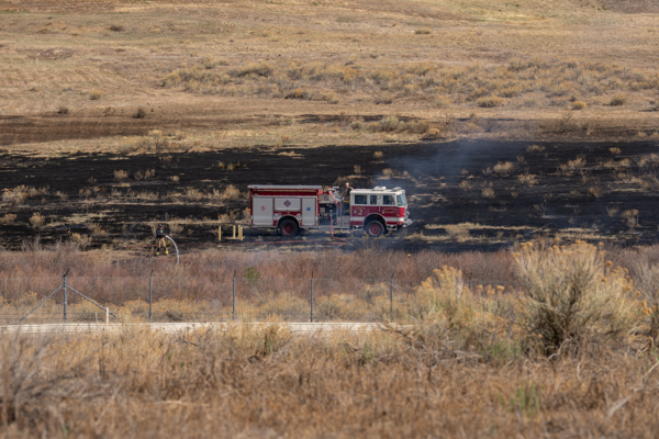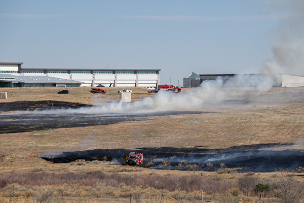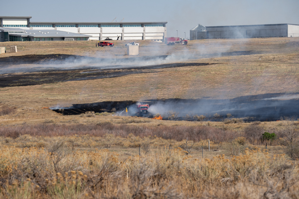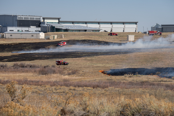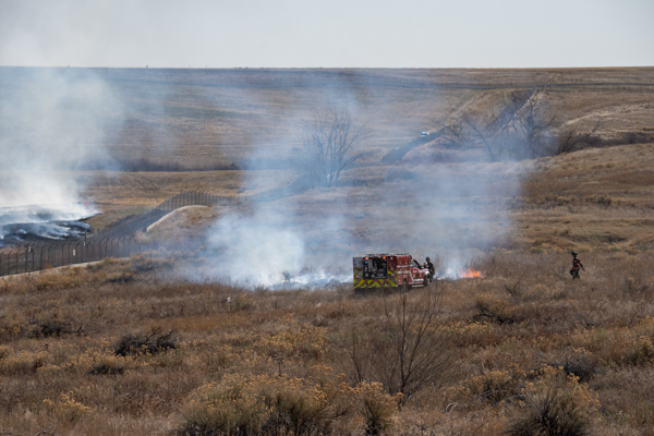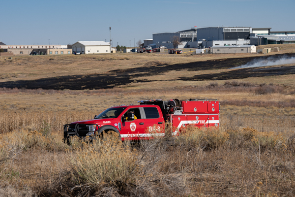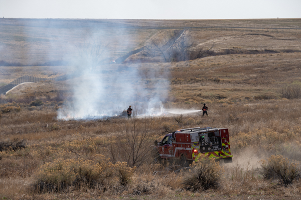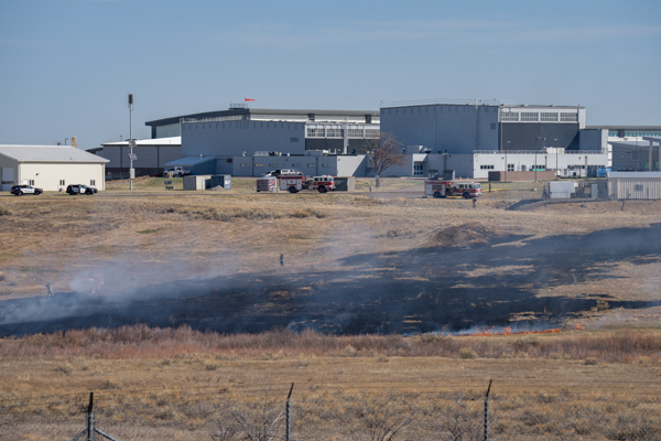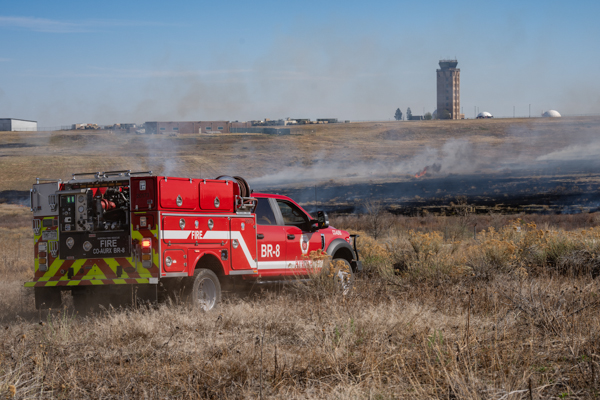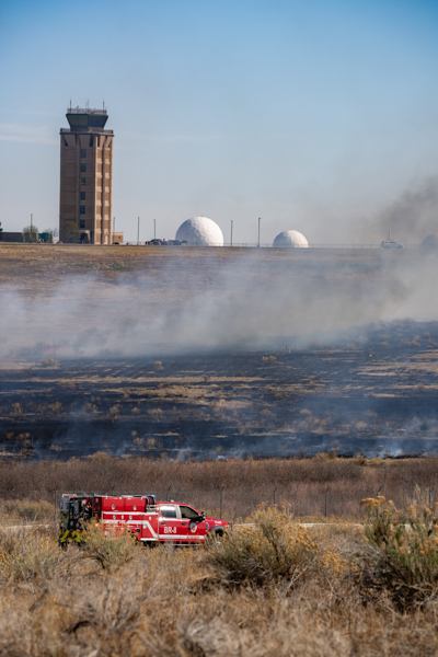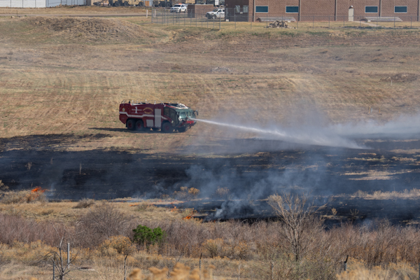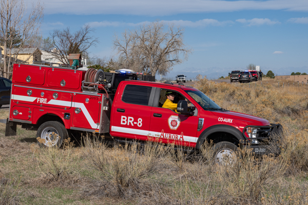 Just before 09:30 on March 29th, 2026 Aurora Fire Rescue was dispatched to the area of E. Mississippi Ave. and E. Ceylon St. for reports of grass fires burning nearby. While enroute, a large plume of smoke was widely visible. Upon arrival, Battalion Chief 4 observe Buckley Space Force Fire & Emergency Services Firefighters working to control vegetation fires inside of base property, and two small fires burning on City of Aurora property. Engine 9 and Brush 8 began direct attack and quickly contained both fires. Additional Aurora crews positioned along the base perimeter fence and protected the adjacent vegetation from igniting. A mutual-aid brush truck from Sable Altura Fire Rescue also responded. Buckley Crash 1, Crash 2 and Crash 3 conduced mobile direct attack on multiple flame fronts. Engine 1 and Tender 8 provided water supply and advanced lines for fire suppression, and Engine 2’s 4×4 was used for mop up in the heavier fuels. During the incident no structures were threatened in Aurora, no injuries occurred, and no emergency phone notifications were needed. The incident was under control at 10:45 and with no further threat of the fire spreading into Aurora, AFR crews were released by Buckley command. Buckley Space Force Base is leading the investigation. Additional information provided by Aurora Fire Rescue