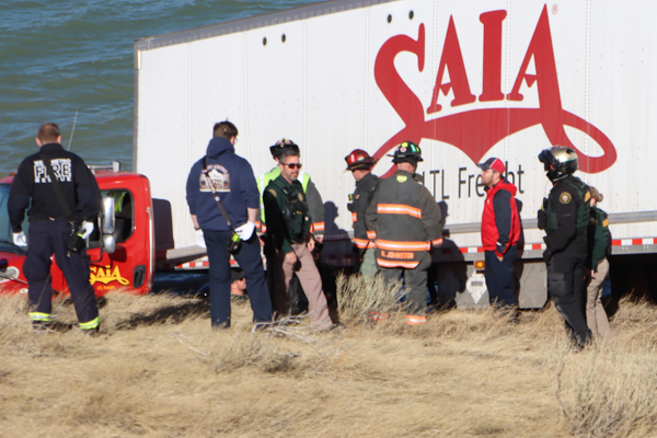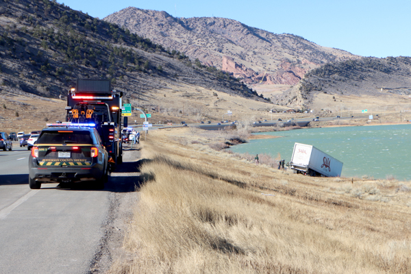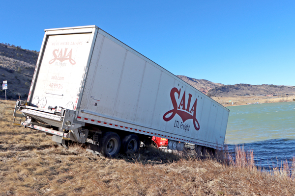 On January 15th, 2025 at 13:16 West Metro Fire Rescue was dispatched to an MVA on westbound C-470 at mile marker 5. Upon arriving, crews located a tractor-trailer that come to rest down the embankment of the east side of C-470. The semi had jackknifed and slid down the embankment and the rear tires of the tractor were partially submerged in the water of Soda West Reservoir Number 1 next to Soda Lakes in the Bear Creek Lake Park. Crews used a ladder to assist the driver up the steep embankment, at the waters edge. West Metro Fire Rescue determined that the truck and trailer had been blown off the highway, due to high winds in the area. Bear Creek Lake Park Rangers stated that winds were recorded as high as 51 miles per hour at the visitor center. The driver was evaluated at the scene and released. No other injuries were reported. Additional information was provided by West Metro Fire Rescue and the Bear Creek Lake Park Rangers.