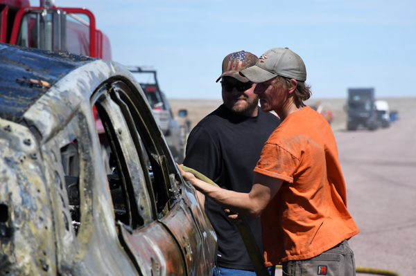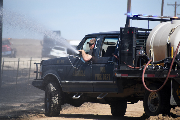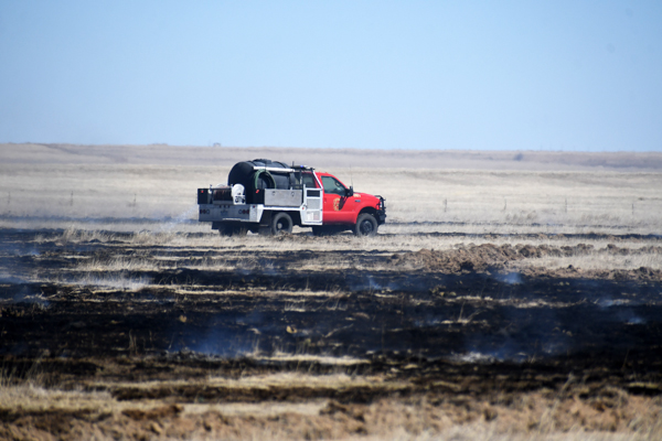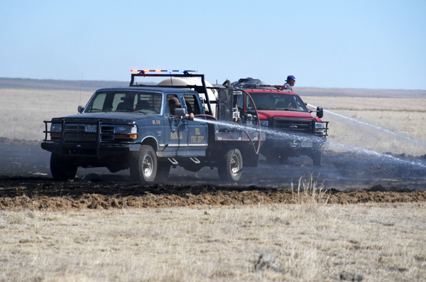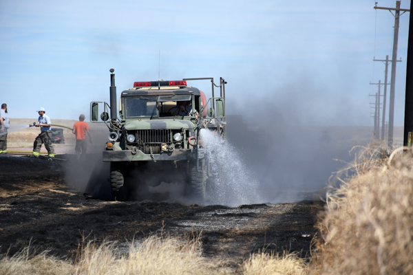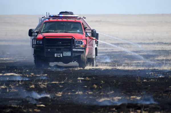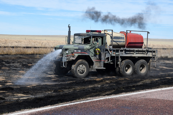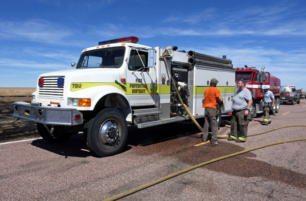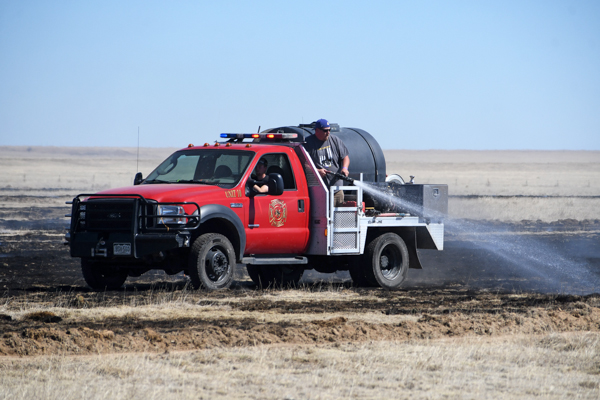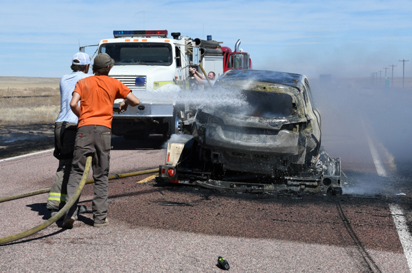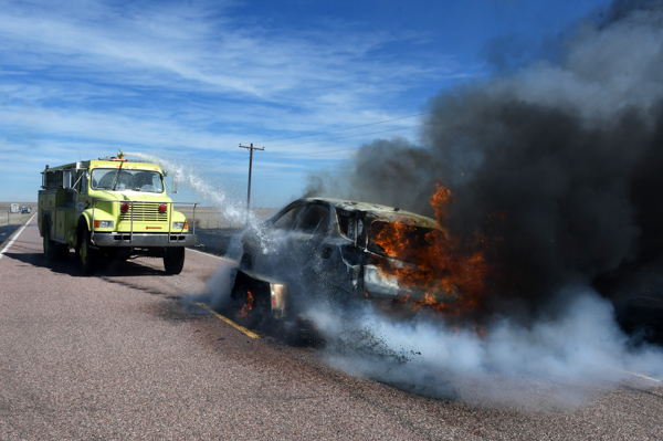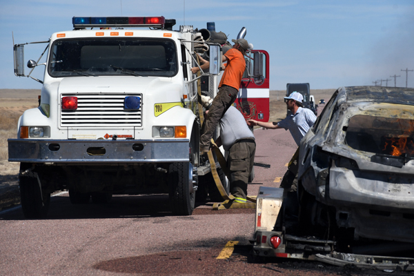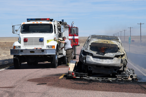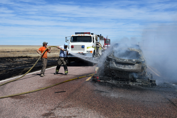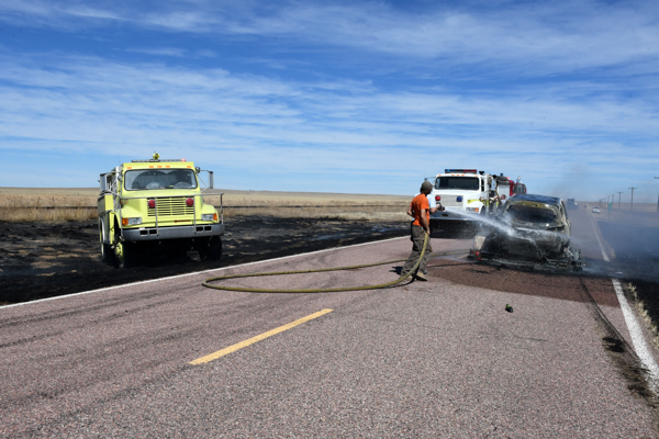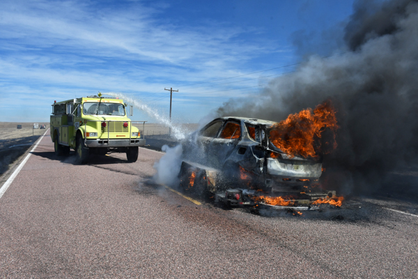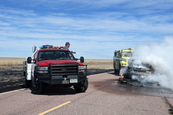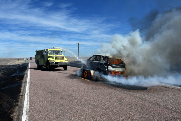 On March 21st, 2026 at approximately 13:30 the Kiowa County Fire Protection District was dispatched to a reported vehicle and grass fire on Hwy. 97 just west of Haswell. Units arrived on scene to find a fully involved car on a trailer that had spread to the grass on both sides of the highway. Firefighters were on scene about an hour extinguishing the fire and mopping up hot spots. No injuries were reported and deputies believe that the fire started from a bad bearing on the trailed.