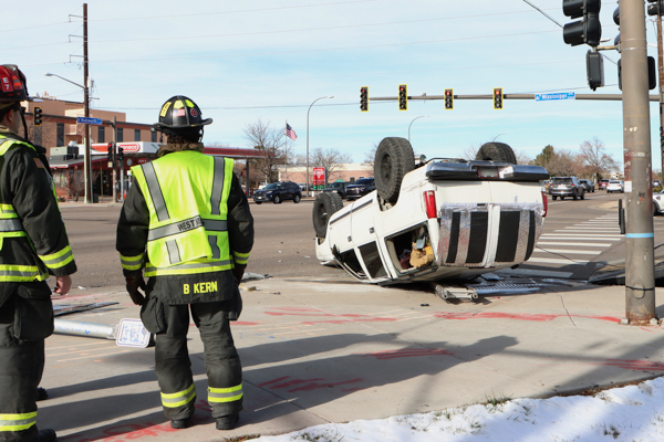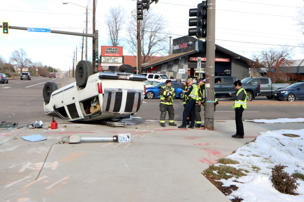 On January 11th, 2026 at 12:22 West Metro Fire Rescue was dispatched to an MVA rollover on S. Wadsworth Blvd at W. Mississippi Ave. in Lakewood. Engine 7 and Medic 7 arrived to a large SUV which had rolled over at the southwest corner of the intersection. The single occupant was self-extricated, evaluated at the scene and released to the custody of the Lakewood Police Department. The SUV also knocked over a push button crosswalk bollard and before overturning onto its roof. A large amount of gasoline and fluids were quickly mopped up. Additional information provided by West Metro Fire Rescue